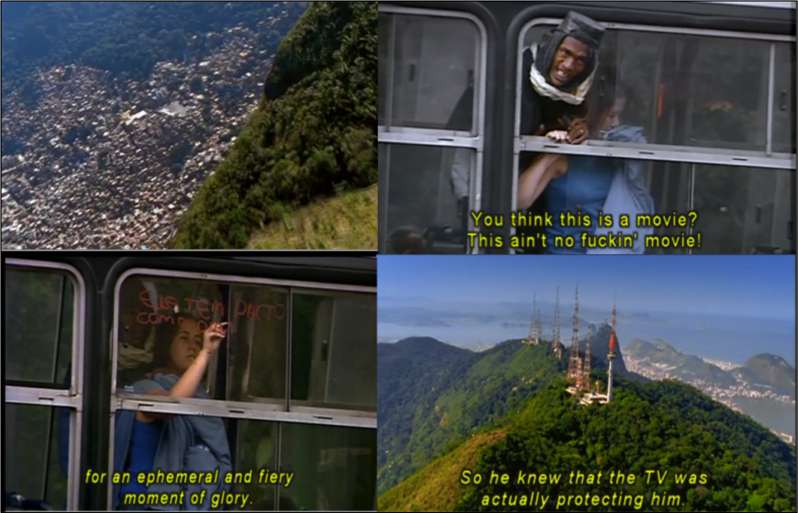 Thus the media stream is interrupted in real time: the public bus is in fact hijacked by the street kid in revolt, Sandro—a sort of Hamlet of the favela with a gun who would tell the hostages to behave as if he were going to shoot them. It is a “real” event, yet the footage (and interviews) weave a meta-tapestry of citations making the screen, and film, the “bus” in question. Since Rio is defined both by its split of social reality into those in and out of the bus—that is, the favella world, which Agamben too facilely allies to “bare life” or the camps, certainly—and a socio-imaginary derived from tele-novelas and el Globo media, the film performs the hijacking of cinema by cinema that the doomed Sandro performs. The film manages to run through citations of successive TV genres by cutting the real footage of the event, including the snuff film performed by the police on him, after one rushes Sandro when leaving the bus and shoots his hostage by mistake. To drive this home, a pan moves to the tele-towers high over Rio spiked into the primeval mountaintops—figures of surveillance and transmission of the circuitry. Faces are ceaselessly blurred to deface identity, encompassing the “invisible” street-kids to gangsters to police: the eye provokes concealment (from the camera itself). There is a recurrence of phones, cameras, communication gadgets, video-game screens, communication towers, and of course, a hijacked bus whose lined windows cite or imply so many screens. The hijacked bus caught in the frame is (also) the telepolis’ containment. The passage through all “media” moves to a different sort of underworld—having started in the open air of the mountains, outside of “life.” This appears in a hostage’s writing huge letters on the window, inversely, with lipstick, messages on the glass, and devolves through sign signals used for the deaf, and the typed archives of the court tracking Sandro’s printed records. And it continues down to the grotesque sunless prison called “the vault,” emptied but covered with unreadable graffiti—the bare inscriptions in the underworld of “the city,” marking, too, the materiality of the footage.
