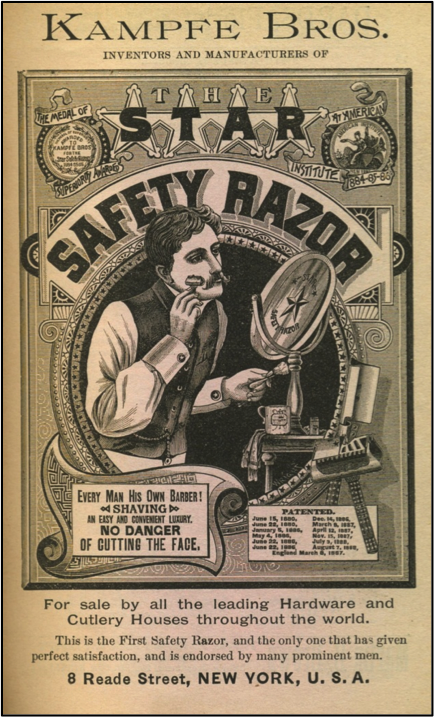 In 1900 the safety razor was not new. Experiments in creating protective sheaths for straight razors had been made since the eighteenth century, and the phrase “safety razor” was first coined in the 1870s by Frederick and Otto Kampfe to describe the Star, a hoe-type razor featuring a wedge-shaped blade with one sharp edge and protected by a wire guard (Figures 2 and 3).[7] This invention—described by Oliver Wendell Holmes as “a lawn-mower for […] masculine growth”[8]—was a response to several cultural trends in the last decades of the nineteenth century. The first was the widespread desire to get rid of the paternal Victorian beard, leaving, initially, the dashing Edwardian moustache and then, by the early twentieth century, the “clean-shaven” face that has, more or less, remained popular to this day as a sign of hygiene and youth, but also, more nebulously, of discipline, honesty and sociability. “It is a curious fact,” noted an advertisement for Williams’s shaving soap in 1901, “that nearly every President of the United States has shaved” (Figure 1). By 1912, even Tarzan, despite the inconvenience of doing so in the jungle, began every day by “scrap[ing] and whittl[ing] at his young beard to eradicate this degrading emblem of apehood.”[9] If more men wanted to shave, they were also increasingly concerned with how to do so while on the move. Travel, for leisure and for work, increased greatly in the late nineteenth century, and the safety razor was advertised as particularly suitable for sailors, salesmen, and tourists—all those who had to face the “danger [of] the lurch or motion” (Figure 4). Holmes’s endorsement of the Kampfe Star came after he’d used it on a transatlantic voyage: “The mowing operation required no glass,” he puffed, “could be performed with almost reckless boldness, as one cannot cut himself, and in fact had become a pleasant amusement instead of an irksome task.” “So pleased” was Holmes with his mower that he took it to show the “distinguished tonsors of the Burlington Arcade,” although “half afraid they would assassinate me for bringing in an innovation which bid fair to destroy their business.”[10]