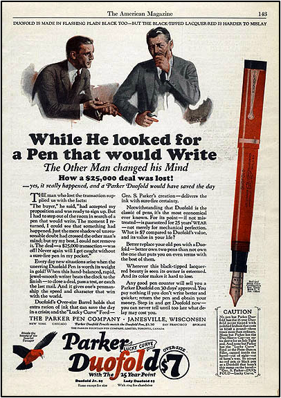 Matches had been “safe” for a long time, but safety in fountain pens was a new idea. The pen Murphy chose to depict was a Parker Duofold (an offshoot of Parker’s 1912 Jack Knife Safety Pen, which had been marketed as “safe” for travelling because it didn’t leak on your white shirt). The Duofold, introduced in 1921, was distinctive because of its tough exterior (safe, the ads suggested, to throw out of planes and from the top of skyscrapers) and because it was so large. Known popularly as the Big Red, it was advertised as having an “over-size barrel [that] holds that extra ration of ink that can save the day in a crisis,” while its “‘Lucky Curve’ Feed […] delivers the ink in sure-fire certainty” (another gun metaphor) (Figure 17). Yes, the pen was expensive—$7.00—but, as one ad insisted, what was that against the $25,000 deal you might lose while you search for a reliable writing instrument? Not what you might gain, mind, but what you might lose. Buy it now, the copywriter implores, or rather threatens: “you can never tell […] what delay may cost you” (Figure 17). A small risk—spilling ink—has been reduced, but the emphasis is on avoiding a much greater one: failure to become rich.