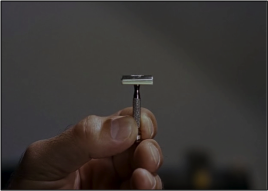 That play on scale also informs Hitchcock’s use of the safety razor in North by Northwest (1959). On the level of plot, the narrative suggests the sort of transformation promoted by frontier-myth: an advertising executive takes on the identity of a spy and travels, incrementally, westward to be reinvented through adventure and romance. But if we focus instead on the bathroom scenes, we realise that Thornhill (Cary Grant) never really changes at all. He is pristine and (as James Mason says) “polished” throughout. Thornhill’s (and Grant’s) fastidiousness means that his suit and his face remain impregnable: dust is sponged off, stubble scraped away, and unlike his mythical alter ego Kaplan, he has no dandruff. On a train called the “Twentieth-Century,” Thornhill encounters Eve Kendall (Eve Marie Saint) and her dinky razor—Hitchcock stops to give it a close up (Figure 21)—and when they arrive in Chicago, he goes to the railroad bathroom to shave, finding himself beside a man with a large cut-throat. The scene has a plot purpose (the shaving foam on his face conceals him from the men who are looking for him) and a certain irony (why bother with a safety razor when you’re in danger of your life?). But it’s also about faces, about the particular brand of masculinity sold by Thornhill, the advertising man, and by Grant, the actor—a brand summed up in Thornhill’s response to Eve’s asking why it took him so long to shave: “big face, small razor.”