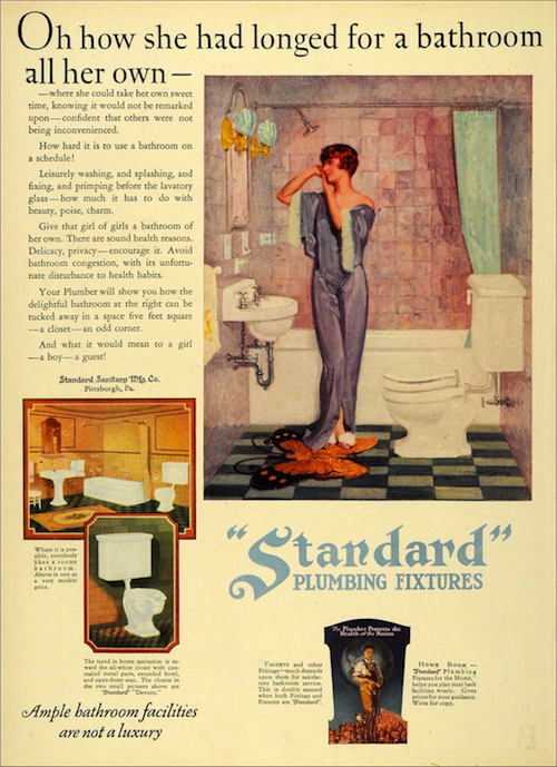 The bathroom was a relatively new setting for writers and filmmakers, indeed for many people: the culmination of developments in piped plumbing and pottery, sanitary reform initiatives, and the increasing demand for “conveniences” that had taken place since the 1890s.[72] In 1913 Ezra Pound used the metaphor of water cooling in a “bath tub lined with white porcelain” to capture the “slow cooling” of “chivalrous passion” and, ten years later, included porcelain baths among the things that America might contribute to “general aesthetics.”[73] By 1925, most residents of big cities had become used to the comforts afforded by water pipes, hot baths, flush toilets, and constant running water, and, an approving Le Corbusier noted, the word “bathroom” was “entering everyday speech.”[74]