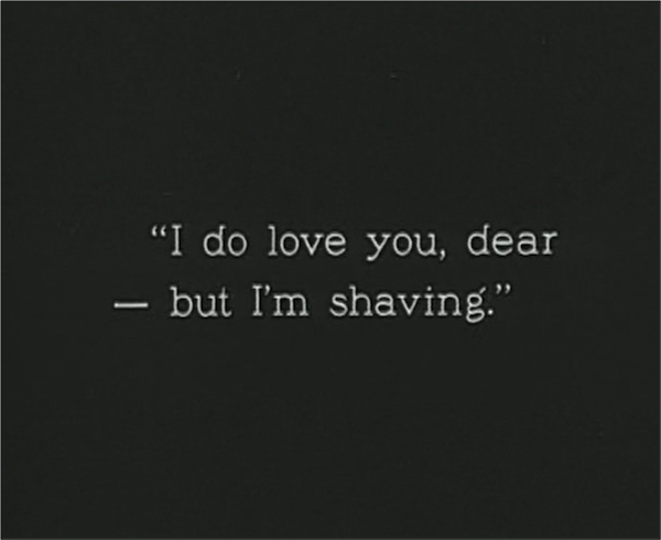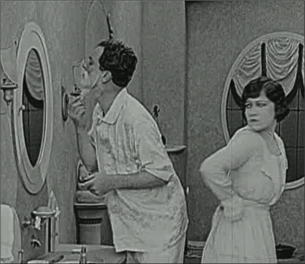 The retreat from the barbershop then was a retreat from massages and violet water, as well as from “contact with brush, soap and barber shop accessories used on other people.”[71] And yet if the imagined ideal was not to come into contact with other people at all, that seemed rarely to be possible, even in one’s own bathroom. 1920s fiction and film is filled with scenes in which men find it almost impossible to shave, not because of any problem with their new razors, but because they have to share a space (the bathroom) with their wives and children.