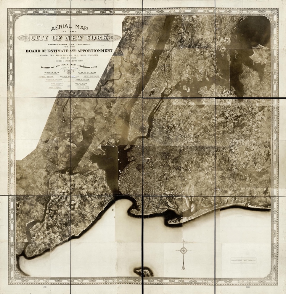 Aerial photographs have a reputation for epitomizing the domineering god’s-eye view of militaries, governments, and corporations—for seeing like a state, as James C. Scott puts it.[1] However, studying the history and technical dimensions of aerial photography teaches one how reductive this reputation is. During the First World War, air photos of large swathes of the Western Front were produced by stitching together dozens, even hundreds, of individual images. To produce these “photomosaics,” intelligence workers had to learn to correct each photograph for tilt, scale, radial distortion, exposure, and framing so that it would line up properly with its neighboring images. After the war, former military photographers and map makers were employed by municipalities and private firms to make massive aerial maps of cities using these same techniques (Fig. 2). Although these photomosaics formed the basis for many conventional maps during the interwar period, they belie the conceit of the map in several ways. As against both the atemporal conceit of the conventional map and the snapshot temporality of the single aerial photo, they’re polytemporal: they produce the illusion of simultaneity by compounding images taken hours, days, or weeks apart. They summon the illusion of seamless totality by way of elaborate techniques for rectifying, syncing, and blending. Yet despite these techniques, they contain residues of their scattered temporalities. If resolution permitted us to zoom in to the scale of a few adjacent sections of these images, we’d see shadows leaning in slightly different directions from section to section, or unmelted snow on the ground in one but not the next.