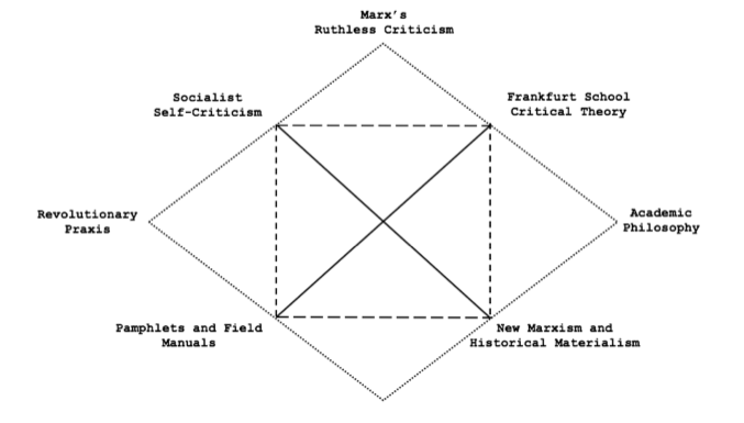 To be ruthlessly critical is to therefore scour literally everything between the heavens and earth: all that exists. It is to totalize. But totalizing criticism is not exclusively or even primarily the work of an individual; it belongs to what Marx would later call the “general intellect,” or more specifically to what Georg Lukács would eventually ascribe to the catalytic force of class consciousness: “Only when a historical situation has arisen in which a class must understand society if it is to assert itself; only when the fact that a class understands itself means that it understands society as a whole and when, in consequence, the class becomes both the subject and the object of knowledge; in short,” he confirms, “only when these conditions are all satisfied will the unity of theory and practice, the precondition of the revolutionary function of the theory, become possible.”[17] And yet, in the long passage from 1843 through the 21st Century, thinking of this sort has decomposed into its constitutive parts, and it has done so in ways that have shaped the interlocking regions of criticism through the intervallic period. The primary severance—between criticism produced on the academic’s writing-desk and criticism forged in the exoteric world of workers and factories and fields—is as much the result of political and economic history as it is of philosophical inclination. The two complementary yet disunited forms of criticism can be figured sharply in the difference between self-criticism as understood by the Bolsheviks and their successors, and critical theory as pioneered by the Frankfurt School, and how they respond to the conditions of either socialist statecraft or capitalism’s decay into fascism.
